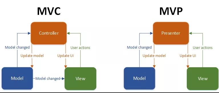 또한, Presenter의 경우 View와 직접적인 상호작용을 통해 UI 변경 등에 관여하는 것이 아니라, view를 참조하여 view 내의 UI를 변경하는 메소드 등을 호출함으로써 간접적으로 view를 변화시킨다.