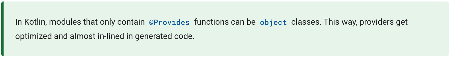 @Provides만 포함되는 Module의 경우 object 형태로 생성 했을 때 provider는 최적화 된 코드를 제공하며, inline 된 코드로 제공된다.