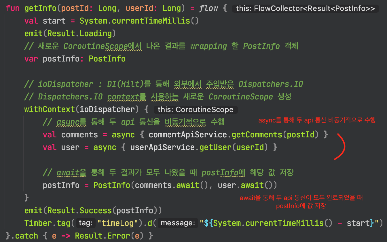 이를 위해 flow block 내에서 IO Dispatcher의 context를 사용하는 CoroutineScope를 새로 생성하여 해당 Scope 내에서 async를 통해 api 통신을 비동기적으로 수행하고, await을 통해 두 값이 모두 수신 되었을 때 두 값을 emit 하는 형태로 구현하였다.