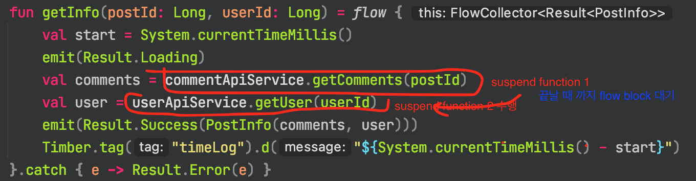 조건 : retrofit을 활용한 api 통신을 수행하는 2개의 suspend function을 통해 flow block에서 댓글 목록과 글쓴이의 정보를 가져와 PostInfo 객체로 wrapping 하여 emit해야 함.