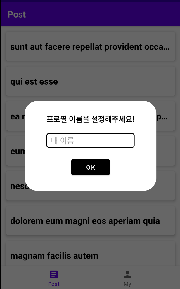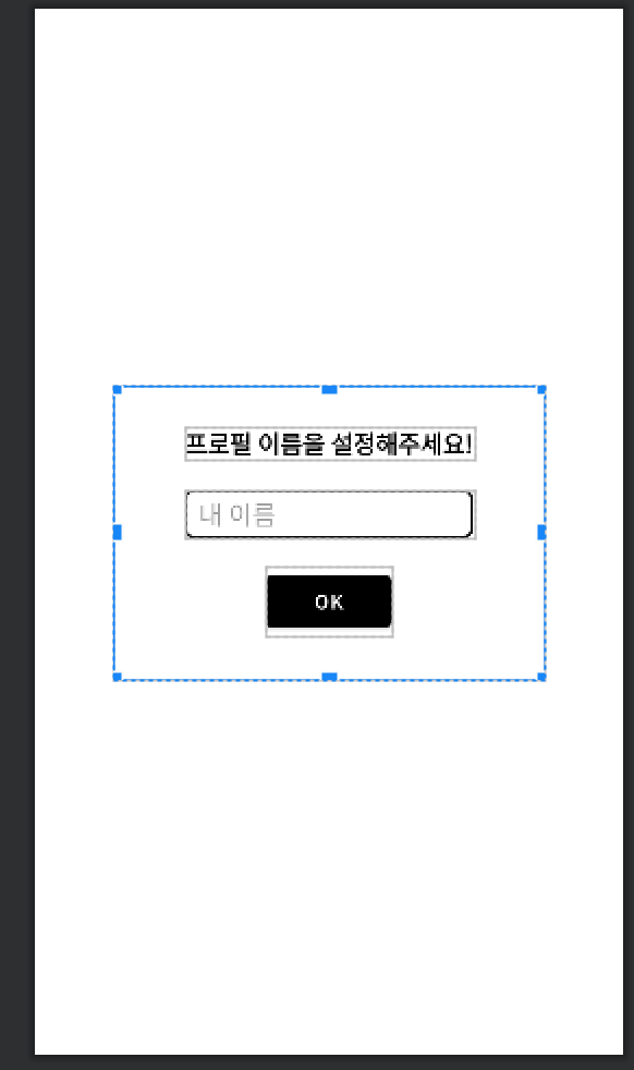 만들게 된 이유 : 앱 기능 중 Shared Preference를 이용하여 초기 프로필 이름 설정이 존재. 해당 Dialog를 커스텀하게 만들기 위해.