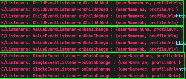 해당 DB 상태에서 아래와 같이 3가지 형태의 리스너를 달고 앱을 실행해보았다. (필요한 코드만 삽입)