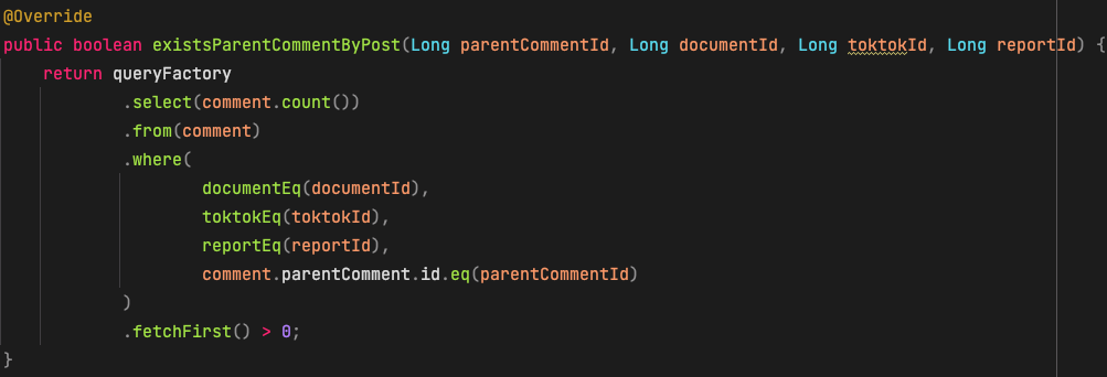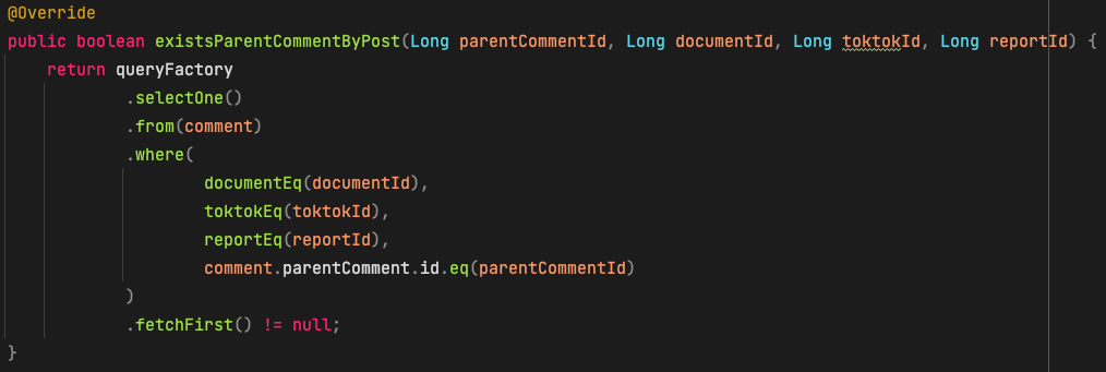 이 때, 조건에 해당하는 row가 발견되지 않으면 fetchFirst의 결과가 null이므로, null 여부를 통해 exists의 결과를 반환할 수 있다.