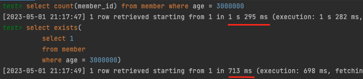 count 쿼리의 경우 약 1.3초, exists 쿼리의 경우 약 0.7초로 성능 차이가 측정되었다.