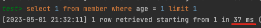age = 1로 변경하여 테이블의 앞에 위치하는 데이터의 존재여부를 확인했을 때,