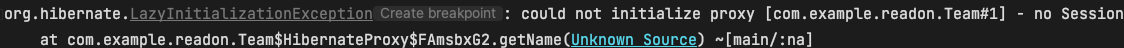아래와 같이 OSIV를 false로 설정하고 @Transactional 어노테이션을 제거하였을 때, LazyInitializationException이 발생함을 확인할 수 있다.