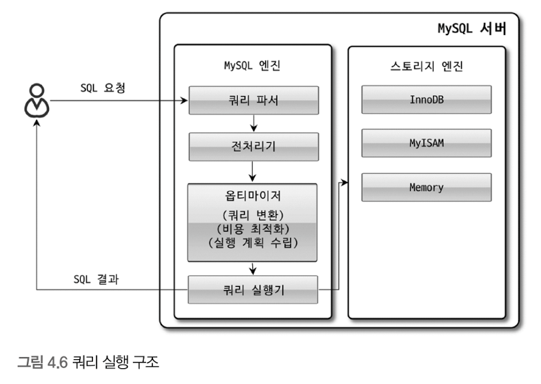 - 커넥션 핸들러 : 클라이언트와의 접속, 스토리지 엔진에게 데이터 R/W 쿼리 요청